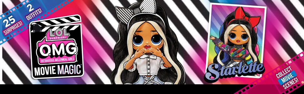 Unbox 25 surprises including LOL Surprise Movie Magic OMG fashion doll Starlette and 3D glasses to reveal additional surprises! Starlette has stunning features and styled hair, and she is articulated for tons of poses. Plus, she’s the big sister to fan favorite LOL Surprise characters, Pop Heart and Kansas QT.