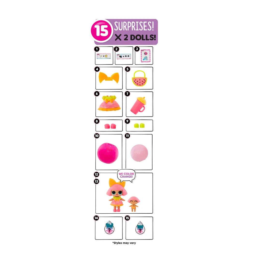 Collect all 9-brand new 2-n-1 LOL Surprise Me & My Lil Sis Color Change Surprise pairs and complete the set!