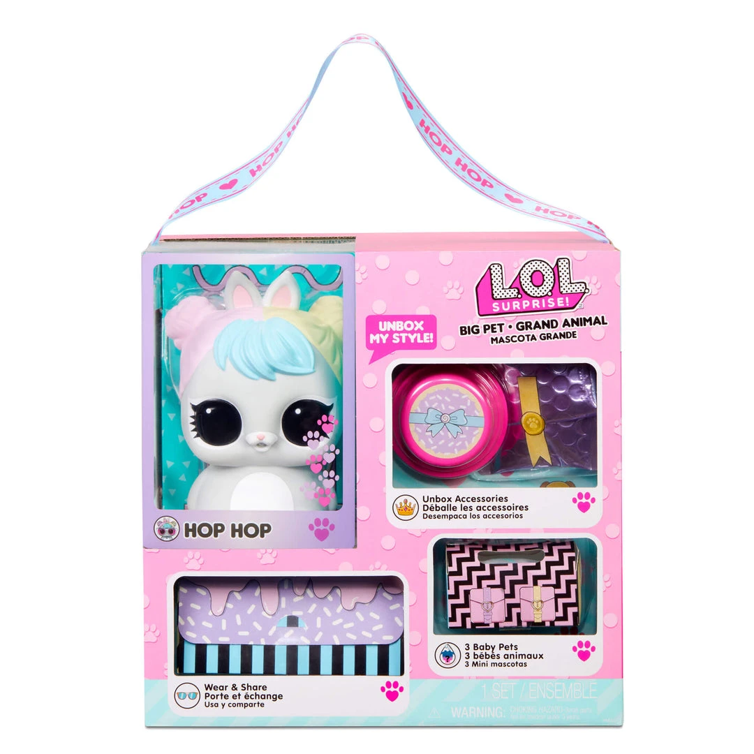 LOL Surprise Big Pets have tons of surprises inside and include wear-and-share accessories for you! Put on the Eye Spy series spy glasses to find codes and unlock surprises, and then share the glasses with your Big Pet! And her necklace becomes a bracelet for you! Comes with 1 wish bone, 1 funny bone, 1 fortune teller heart, 1 baby reveal. Hop Hop can be worn as a backpack or used as a piggybank. Also comes with a light pink purse carrying case.