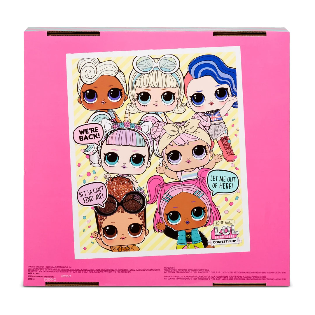 The surprise party unboxing includes a surprise POP of confetti in every ball. Unbox 9 layers of surprise in each ball, including an LOL Surprise doll with a water surprise. Feed or bathe your doll to reveal a water surprise. Will your doll cry, spit, tinkle or color change?