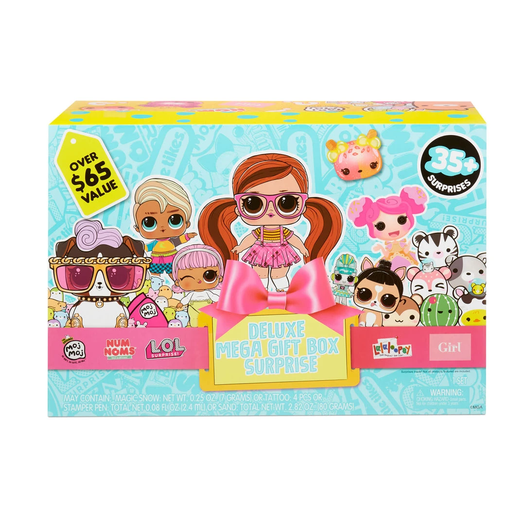 Unbox the ultimate mystery box featuring all your favorite brands. Deluxe Mega Gift Box Surprise features 35+ surprises from fan favorite brands like LOL Surprise, Lalaloopsy, Num Noms, Moj Moj and more.
