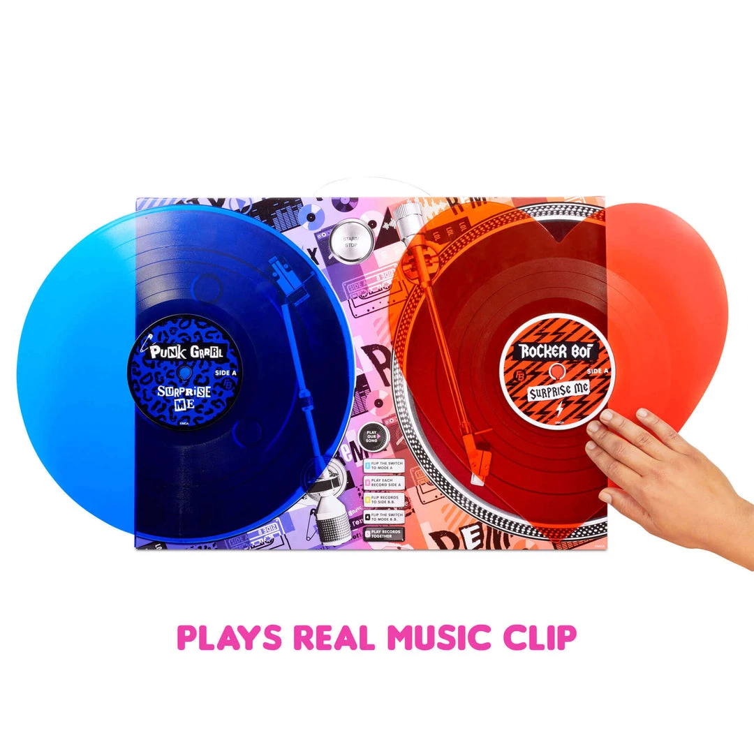Unbox 2 full-size records and play them on the record player packaging. Play each record on its own to play Rocker Boi’s and Punk Grrrl’s piece of their song “Surprise Me.” Then, flip the records to Side BB, flip the switch on the packaging and play the records together to play the duet piece of the song. Have these rock stars strike a pose on their included doll stands. They also include a magazine with the lyrics to their song.