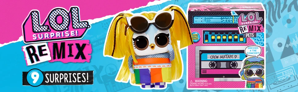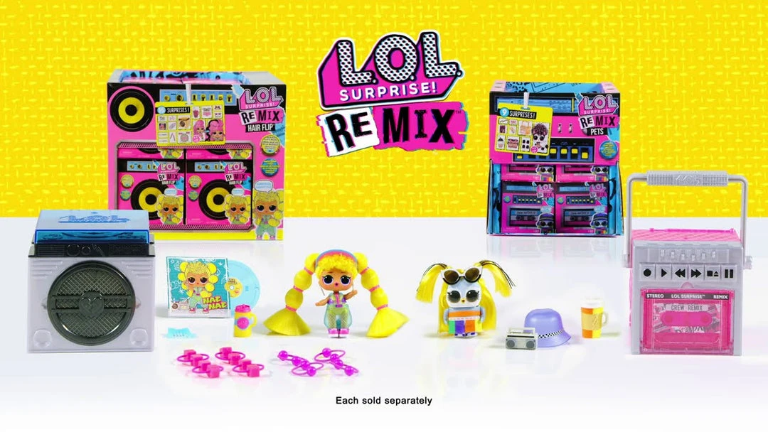 Collect all 12 LOL Surprise Remix Pets. Collect to build a boombox by connecting 2 LOL Surprise Hair Flip and 1 LOL Surprise Remix Pets packages. Collect music and lyrics from the entire LOL Surprise Remix line to complete the whole song. Or, mix & match lyrics to create your own remix.