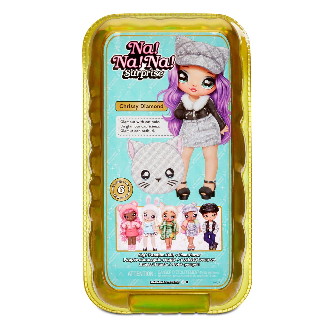 Na Na Na Surprise dolls are the first-ever soft, posable fashion dolls with printed face and fashion details. Now featured in a window box to show off all the quality details, it will be easier than ever to collect them all!​ Chrissy Diamond comes with a tag with her name, birthday and a little about her.