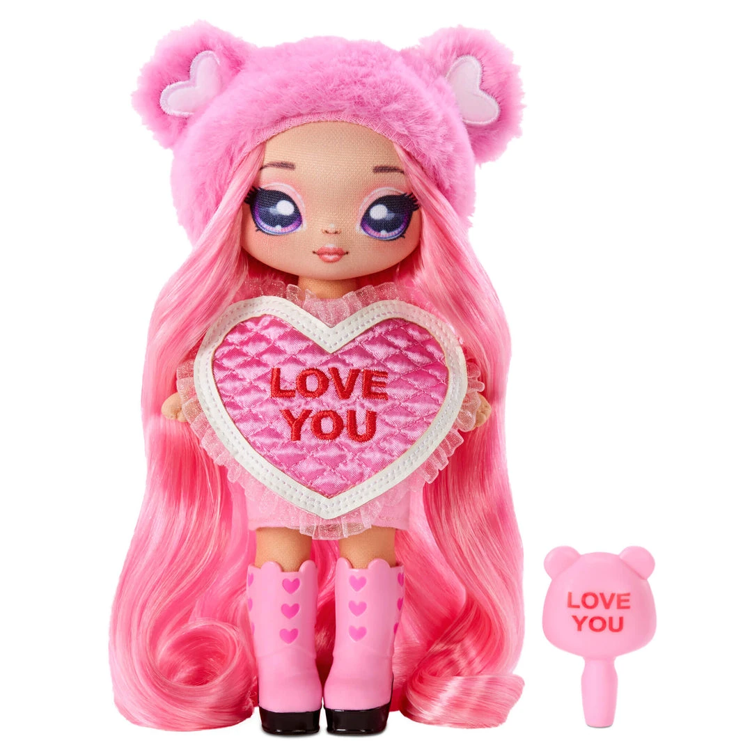 Celebrate that special someone in style with the all new Na Na Na Surprise Sweetest Hearts Fashion Doll Series! You get a soft fashion doll plus a matching brush with sweet candy heart-inspired sayings! Each doll has an adorable, quilted heart-shaped dress, bear-shaped beanie, and themed shoes to match!