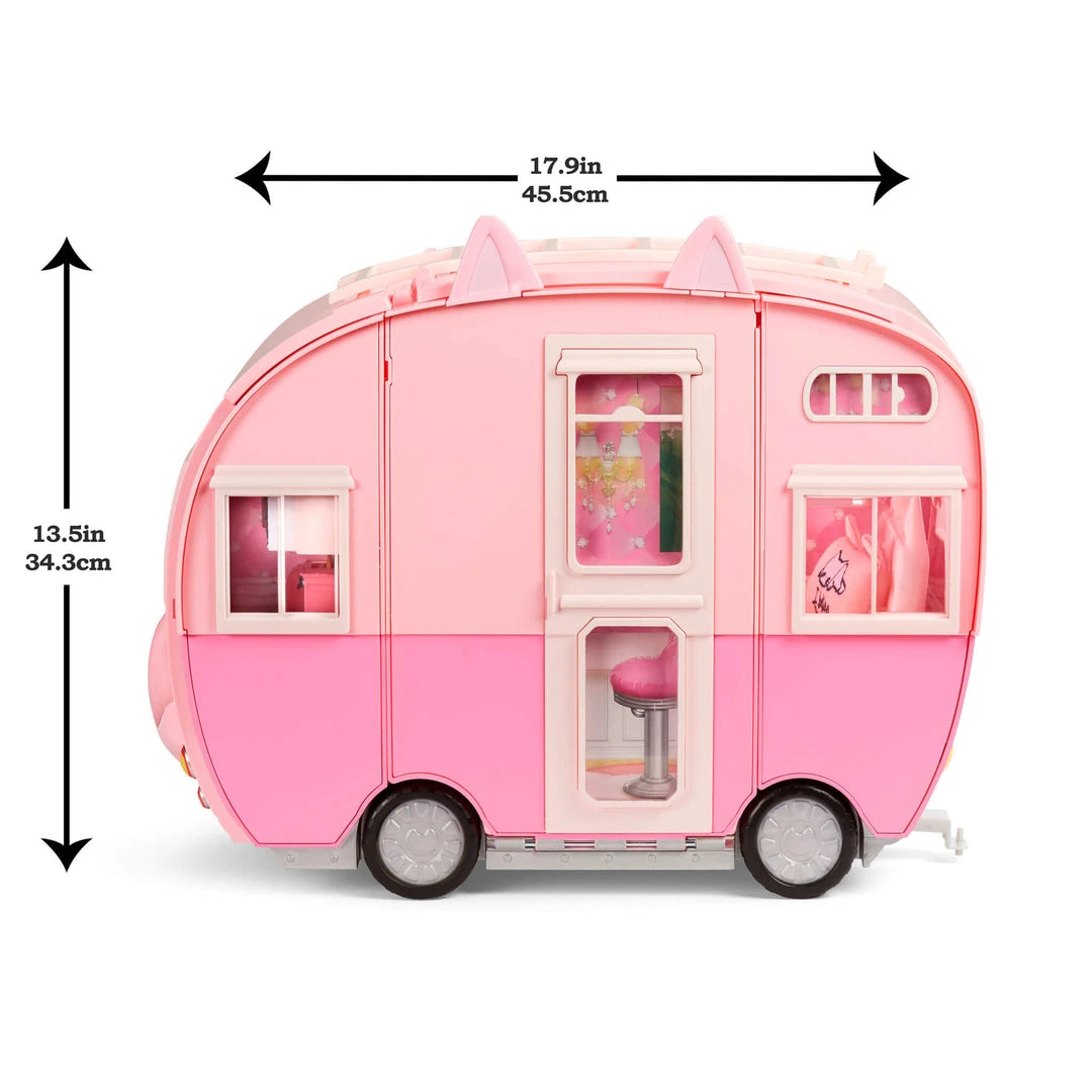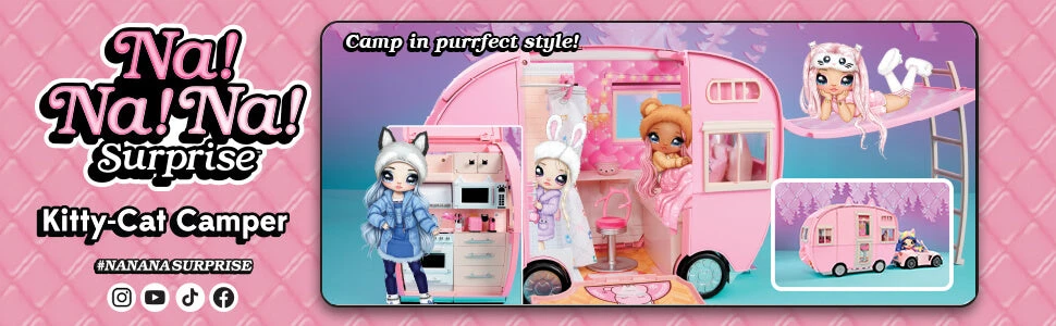 Camp in purrfect style with the Na Na Na Surprise Kitty-Cat Camper! Na Na Na Surprise soft fashion dolls can hit the road now in their own kitty-themed, cozy camper!