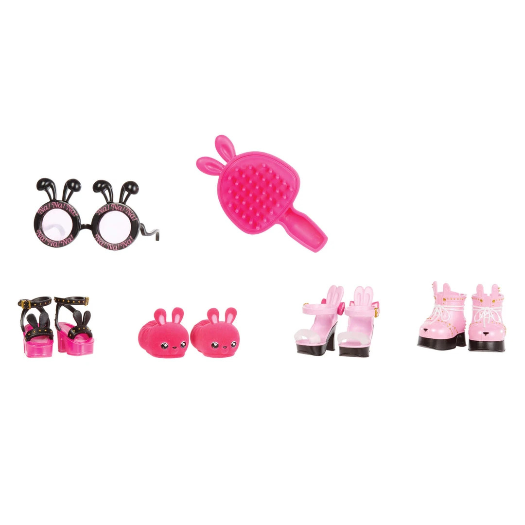 She adores fashion and all things chic. Her cute, animal-themed hat is removable, so you can brush and style her gorgeous, long, hot pink hair. Mix and match all her fashions to create more than 100 unique looks. Â The giant Black Bunny pom can also be used as storage for fashion doll and her accessories.