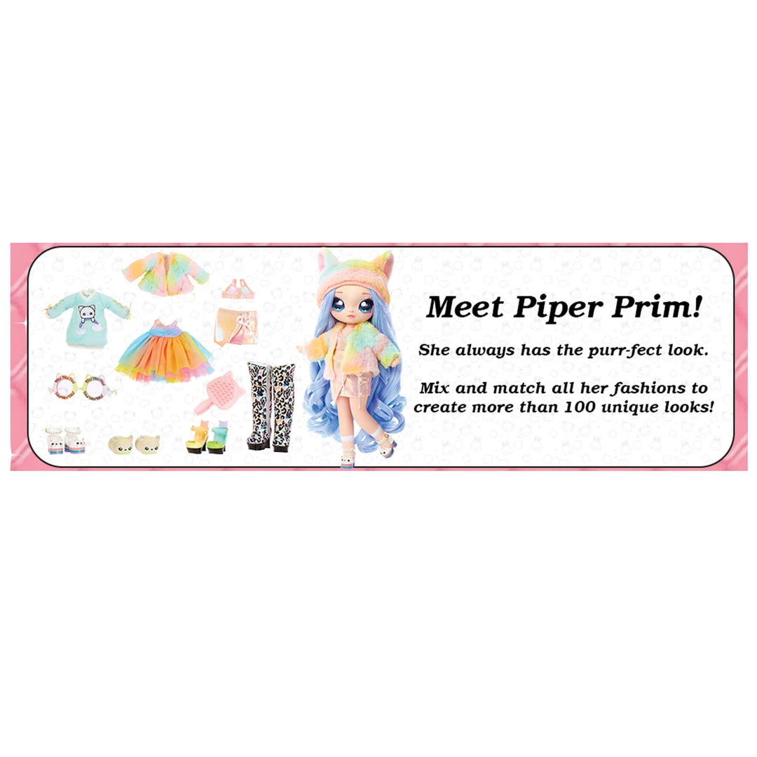 POP balloons to reveal fashions and accessories. Then, reveal a NEW 11″ Na Na Na Surprise Teens fashion doll. Meet Piper Prim!