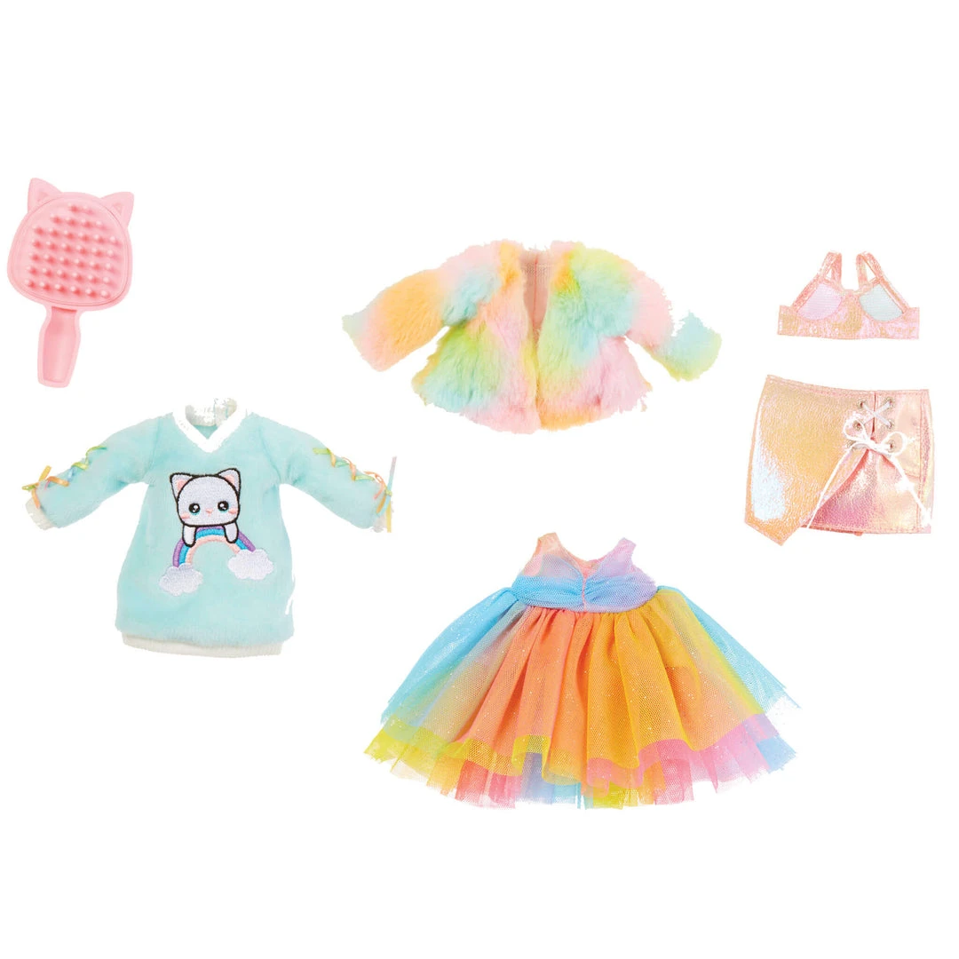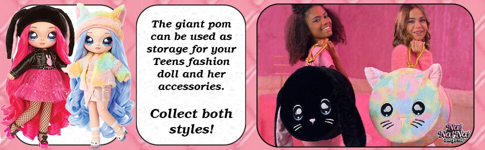 She always has the purr-fect look. Her cute, animal-themed hat is removable, so you can brush and style her gorgeous, long, purple hair. Mix and match all her fashions to create more than 100 unique looks. Â The giant Rainbow Kitty pom can also be used as storage for fashion doll and her accessories.