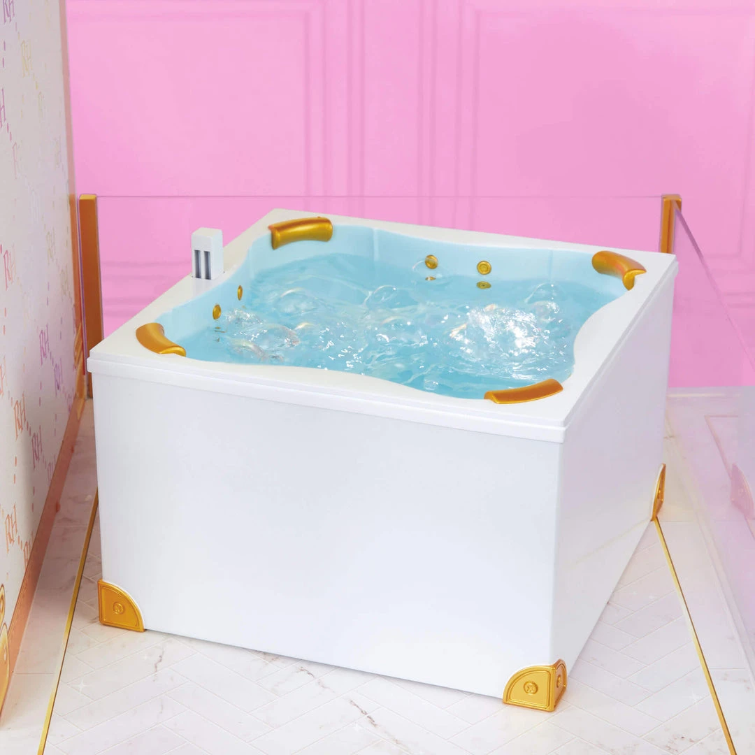 Enjoy the realistic features like the real working shower & sink (After filling with water, the shower and sink both spray water), the bubbling hot tub (Fill the hot tub with water, press the button and get bubbles! Fits 4 Fashion Dolls.), the working elevator (Elevator moves up and down and fits 2 dolls!), Washing machine that really spins, life like furniture like a couch and mattress which are molded in soft plastic. The pillows & bedding are super soft just like home. All the Art Student housing essentials such as, Iconic fashion clothing rack, colorful hangers, clear trunks for storage, 50+ Accessories like – Makeup Palette, Laptop, Coffee Cups, Water Bottles, Silverware, Plates, Toaster & so much more.