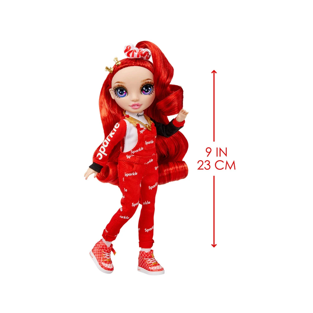 Ruby is a small-town girl with big city dreams! Even in Jr High, she had her own unique style that stood out from the rest. She comes wearing a long sleeve Sparkle top, adorable red Sparkle overalls with gold buckles, checkered high-top Sparkle sneakers, and her school essential accessories.