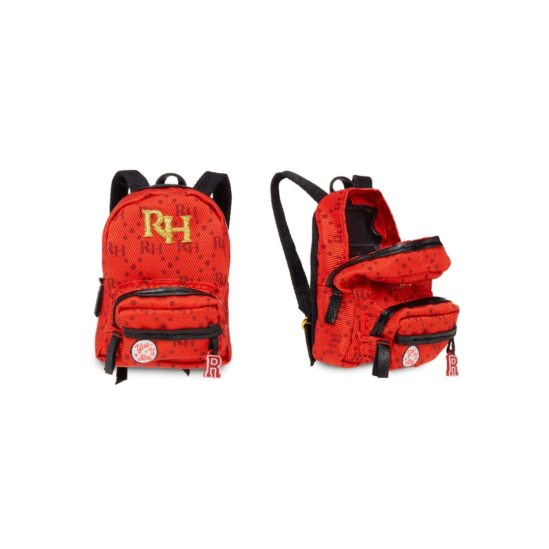 Ruby has been creative at a young age. She’s always loved to find new ways to style old favorites. No surprise, her custom backpack is fire. She comes with a soft fabric red backpack that opens and closes with a custom designed patch and RH gold embroidery. Perfect accessory to store her sparkle satin scrunchie, two gold hair clips, and R necklace.
