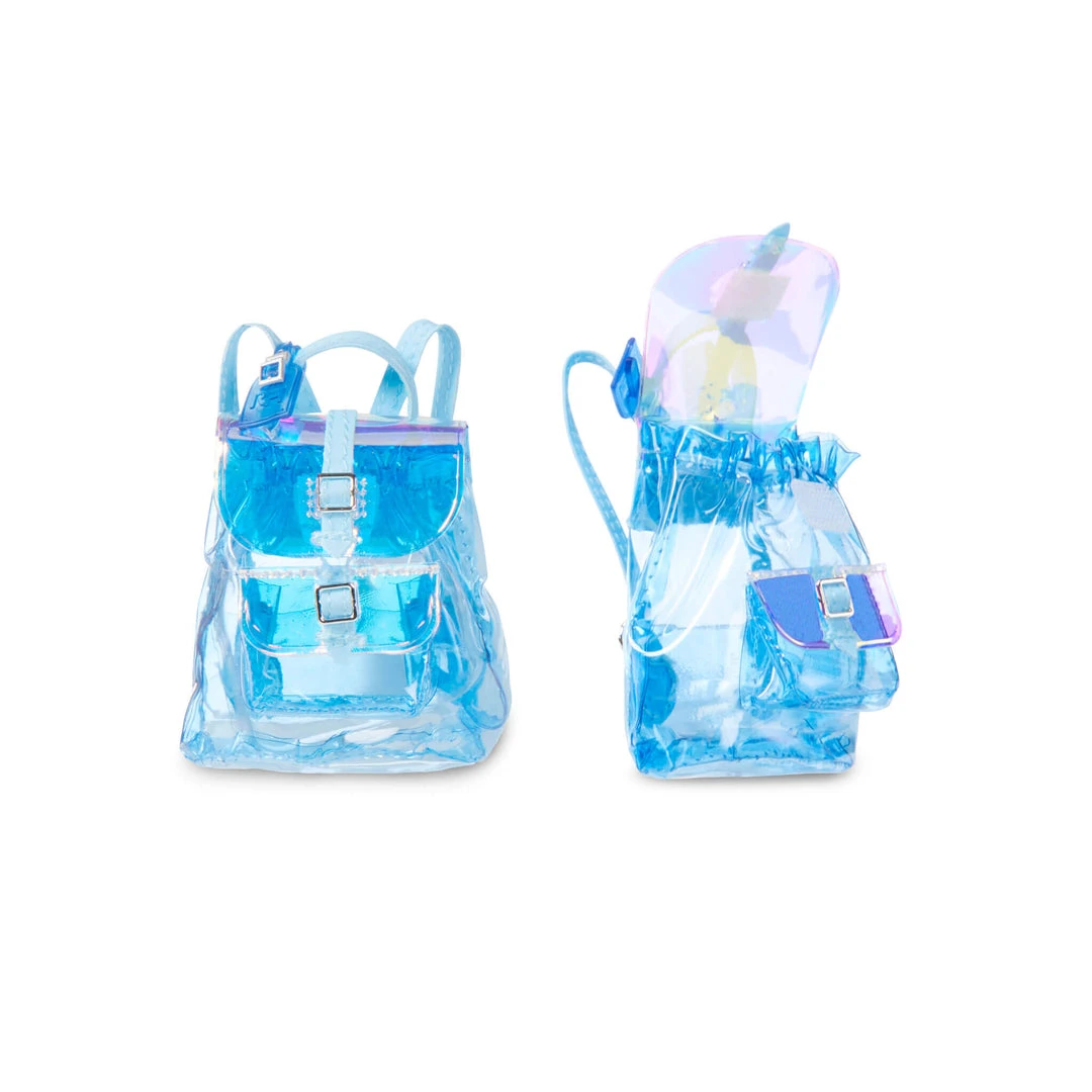Skyler knows that creativity can spark at a moment’s notice, so she never leaves home without her backpack to carry her creative essentials. She comes with a soft fabric holographic iridescent blue vinyl backpack that opens and closes. Perfect accessory to store her hair tie.